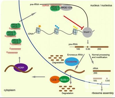 siRNA是一类长度约为22个核苷酸长的非编码小RNA,广泛存在动植物中,在机体的生长发育、生殖遗传和免疫防御等方面行使重要功能,也是优秀的药物分子。光寿红课题组多年来以秀丽隐杆线虫为研究对象,通过正向和反向遗传学筛选,鉴定了一系列抑制内源siRNA产生的SUSI因子,该类因子广泛参与了细胞中核糖体RNA加工和降解的过程。当SUSI因子功能缺陷时,细胞内会积累错误加工的核糖体RNA片段,这些片段与RNA依赖的RNA聚合酶相互作用后,会进一步诱导risiRNA的生成。risiRNAs与核糖体RNA序列互补配对,通过激活细胞核RNA干扰通路,进而调控核糖体RNA水平。
