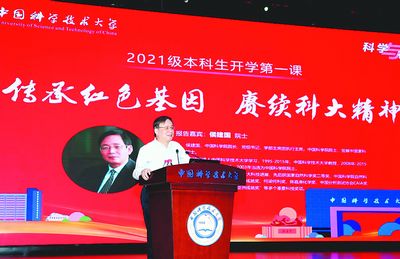 本报讯 9月22日晚,中国科学院院长、党组书记侯建国以“传承红色基因、赓续科大精神”为题,向中国科大1900余名2021级本科新生讲授“科学与社会”研讨课的“开学第一课”。中国科大校长包信和主持研讨课。