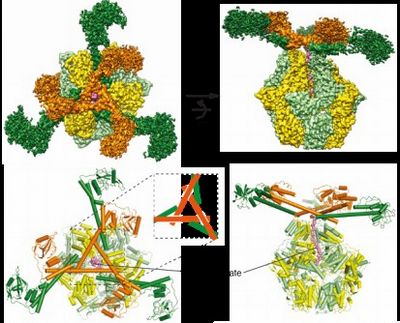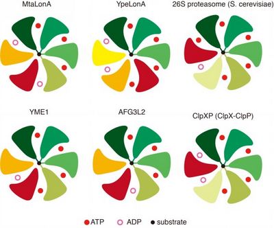 图为AAA+蛋白酶与底物结合的核苷酸结合状态比较。顶部视图显示了核苷酸和底物的结合状态。与底物结合的原体呈不同深浅的绿色。