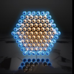 图为单原子壳层双催化剂模型示意图。其中金色和蓝色小球分别代表金和铂原子。