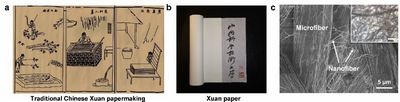 图为传统宣纸的表征和多尺度薄膜的制备,以及基于多尺度薄膜制备的柔性电子设备。(a)《天工开物》宣纸的工艺示意图。(b)宣纸照片。(c)宣纸的SEM图像和偏光显微镜图像。