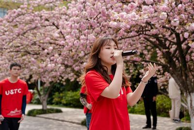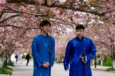 几十年来,无数科大人都曾路过这樱花树下,带着“红专并进,理实交融”的校训奔赴远方。无论走到哪里,我们都忘不了那句“永远科大人”。“理想比天高,‘墨子’太空遨!您听听,我这句怎么样?”两名学生表演的相声《永远科大人》,以“红专并进,理实交融”的科大校训八个字为字头作诗,引得师生纷纷驻足。他们本色精彩的表演,也赢得了网友的交口称赞。(图2)国家的希望在青年,民族的未来在青年。几十年来,在党的坚强领导下,科大青年学子与全国广大青年一起奋战在祖国最需要的地方,为中华民族伟大复兴贡献青春和力量。樱花树下,科大学子带来的手语歌曲《听我说谢谢你》,以自己特有的方式传递温暖,表达着对伟大祖国的热爱,号召科大学子奋进新征程、建功新时代。“冬奥是我们友好的邀约,冰丝带将彼此紧紧相连,火红点缀雪白的冬天,友谊作线编织中国结。”身着火红USTC短衫的四位同学,给大家带来激情澎湃的北京冬奥会原创说唱歌曲《傲冬》,传承着冬奥自强不息、顽强拼搏、敢于超越的精神,赢得了现场观众阵阵掌声。(图1/2)
