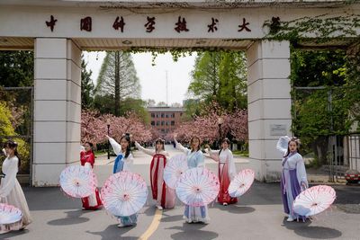 “云赏樱”直播活动,从东区老北门开始。1970年,科大南迁合肥时,广大师生就是从老北门起步,开启了二次创业的新征程。身着汉服的7名校舞蹈团成员,衣袂飘飘地跳起伞舞《青花瓷》,轻柔的舞姿再现盛世古风,拉开了整场直播的序幕。(图3)