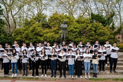 “像悬崖的孤松一样,深深扎根,不惧荒凉;要像远去的流星一样,纵然孤独,亦要发光。”在郭沫若广场郭先生的雕像下,学生合唱团带来的大合唱《一样》厚重深邃、慷慨激扬,号召全校师生传承和弘扬“抗大精神”“两弹一星精神”和老一辈科学家精神,高质量建设中国特色、科大风格的世界一流大学,以优秀成绩迎接党的二十大胜利召开。(图4)