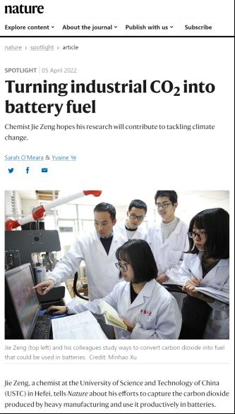 本报讯 近日,中国科大合肥微尺度物质科学国家研究中心和化学物理系曾杰教授接受Nature专访,分享了他在二氧化碳催化转化领域的最新研究进展。该采访以“Turning industrial CO2 into battery fuel”为题,发表在Nature亮点专栏。