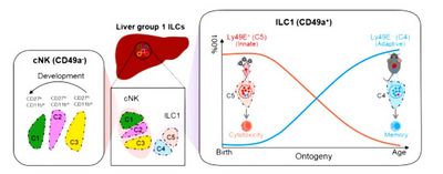 课题组通过单细胞测序技术与流式细胞分析技术发现,肝脏ILC1s可以划分为Ly49E+和Ly49E–两群细胞。利用可诱导的谱系示踪小鼠模型,发现Ly49E+ILC1s主要由胚胎造血前体产生,在个体发生早期占主导,出生后可长期自我维持而不依赖造血前体细胞;Ly49E–ILC1s则依赖于造血前体细胞的不断补充,且随着年龄增长,该群细胞逐渐成为肝脏ILC1s的主要群体。在功能方面,Ly49E+ILC1s具有更强大的细胞毒性,可以在新生期介导有效的抗病毒免疫反应;而Ly49E–ILC1s具有更强的免疫记忆潜能,可以介导机体对半抗原的记忆免疫应答。
