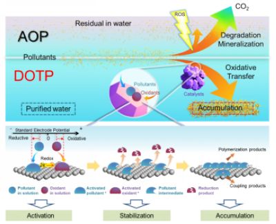 非均相催化过硫酸盐氧化技术作为一种新兴的化学氧化技术近年来发展迅速。前期的研究表明该技术体系中有机物污染物的去除过程主要是高级氧化过程(AOP)。通过文献调研,课题组的博士生张颖捷和博士后黄贵祥发现这些体系中普遍存在电子当量不守恒的现象,即污染物矿化给出的电子总量远大于氧化剂所能接受的数量。基于此矛盾现象,他们对这些体系进行了系统且深入的研究,从源头上揭示了在这些体系中实际占主导的是一种本质上与AOP不同的DOTP。在DOTP中,污染物和氧化剂在非均相催化剂表面发生2电子的直接氧化还原反应,产生的污染物中间体被催化剂表面稳定化,并自发进行表面聚合反应或表面偶联反应,形成的产物富集在催化剂表面,从而实现水中污染物的有效去除。