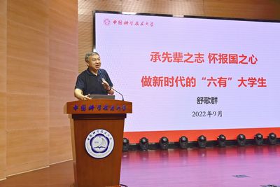 舒歌群带领同学们回顾了中国科大64年栉风沐雨、三次创业、再创辉煌的办校历程,以及钱学森、郭永怀、钱临照、杨承宗四位科学家的光荣事迹,并号召大家学习这些老一辈科大人身上所蕴含的宝贵的科大精神。从学校总体概况、潜心立德树人、执着攻关创新、人才培养成效等方面,向同学们展示了在科大就读是一种怎样的体验。