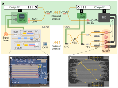 潘建伟、徐飞虎研究组发展了集成光子片上高速高保真度偏振态调制技术,系统重频达到2.5 GHz,量子比特误码率优于0.35%;结合中科院上海微系统所尤立星团队最新研制的八像素SNSPD,实现了高计数率、高效率的单光子探测,在每秒输入5.5亿个光子时仍能保持62%的探测效率;同时,研究组发展了偏振反馈控制、高速后处理模块等。在上述技术突破的基础上,研究团队实现了10公里标准光纤信道下115.8 Mb/s的密钥率,较之前纪录提高了约一个数量级;系统稳定运行超过50个小时,在传输距离328公里下码率超过200b/s。