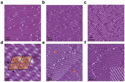 通过理论与实验研究合作,揭示Cu(111)表面单层硼烯的电荷密度调制,并率先利用超高真空分子束外延在Cu(111)表面的单层硼烯上实现了尺寸均一、周期分布的硼团簇可控制备,观察到硼团簇的覆盖度增加时双层硼烯结构形成的STM图像。基于第一性原理计算和STM图像,明确硼团簇是由5个硼原子组成的平面五元环结构,“立式”吸附在单层硼烯表面,揭示了单层硼烯中的电荷分布促进了B5团簇在表面的形成和排列的机制。