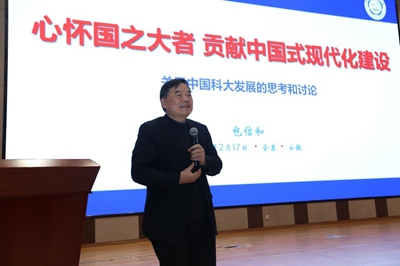 包信和作题为《心怀国之大者贡献中国式现代化建设——关于中国科大发展的思考和讨论》的主题报告,从潜心立德树人、学科能力建设、执着攻关创新、体制机制创新、行政工作要求等方面,深入地交流了他对中国科大发展的思考和建议。包信和指出,潜心立德树人是高校的根本任务。 (下转3版B)