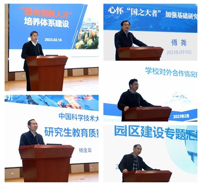 会上,校党委常委、副校长周丛照围绕本科生教育专题作报告,副校长杨金龙围绕研究生教育专题作报告,校党委常委、副校长傅尧围绕科学研究专题作报告,校党委常务副书记蒋一围绕对外合作专题作报告,校党委常委、副校长王晓平围绕园区建设专题作报告。围绕各专题,与会人员进行了深入研讨交流。