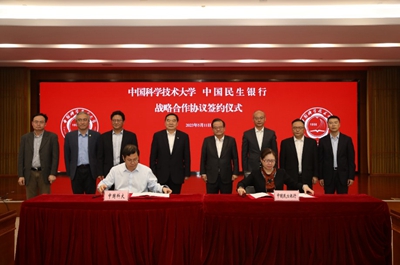 本报讯 5月11日,中国科大-中国民生银行战略合作协议签约仪式在东活五楼国际会议厅举行。校长包信和,校党委常务副书记蒋一,校党委副书记邓建松,校长助理薛天;中国民生银行党委书记、董事长高迎欣,党委委员、副行长陈琼,合肥分行党委书记、行长孙兴出席仪式。学校及中国民生银行有关部门负责同志参加仪式。薛天主持仪式。