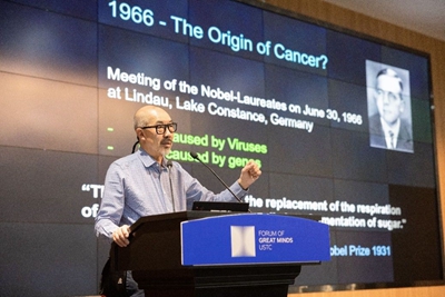 报告中,Mak教授以独特的视角为切入点,从肿瘤的手术治疗、化疗开始讲述肿瘤治疗的发展进程,将肿瘤的产生和发展比喻为一辆急速行驶的马车(horses)。Mak教授认为,应该更多的关注对肿瘤细胞有维持作用的靶基因(carts)。他生动引用中国“阴阳平衡,相互协调”概念,深入阐述免疫与肿瘤的辩证关系,并介绍了其团队开展的研究工作和药物研发进程。Mak教授的报告深入浅出、翔实生动,点燃了现场师生的学术热情,现场座无虚席,交流气氛活跃。Mak教授引用谚语寄语科大学子:“ If you want to go fast, go alone!If you want to go far, go together!(独行者步疾,结伴者行远!)”,以此鼓励大家在科研道路上开拓创新、追求卓越、合作共赢。