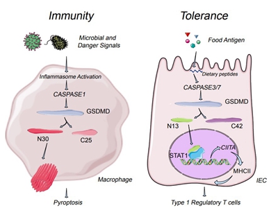 研究人员首先针对生理状态下各个组织细胞的GSDMD进行了蛋白印迹检测,发现检测的各组织样品中只有在小肠的上皮细胞(IEC)中能检测到一条大约13kD大小的剪切带,进一步探索发现这一条剪切带来自GSDMD的N端并且是由食物抗原激活十二指肠IECs中的CASPASE-3/7切割GSDMD的88位天冬氨酸(人源GSDMD是87位)产生的。通过免疫荧光染色以及RNA-seq等实验手段,研究组发现N13片段会入核诱导前端小肠IEC的二类分子表达水平。通过单细胞RNA测序等手段,研究人员发现N13片段缺失造成IEC二类分子下降会进一步导致Tr1细胞减少。由于Tr1细胞也被认为是诱导食物耐受的关键细胞之一,研究人员猜测N13片段最终会参与诱导食物耐受。为此,研究人员针对多种基因表达背景小鼠构建了两组食物耐受模型:花生提取物诱导的花生过敏模型以及OVA诱导的迟发型超敏反应模型,最终证实GSDMD在肠道的生理功能之一是参与构建宿主食物耐受。