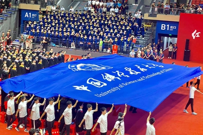 体育馆内,身着学位服的毕业生们排着整齐的方阵,期待着激动人心的时刻。“此去星辰大海、科大等你归来”“科教报国、追求卓越、永远科大人”“高扬理想风帆、肩负时代责任”……一条条饱含真情的横幅,表达了母校对毕业生的真挚祝福。