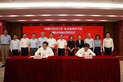 本报讯 6月15日,中国科大与北京协和医学院战略合作协议签约仪式在我校举行。北京协和医学院院校长、中国工程院副院长王辰院士,党委副书记张勤,中国科大校长包信和院士,副校长杨金龙院士,党委常委、副校长周丛照,生命科学与医学部党委书记、附一院党委书记刘连新,生医部副部长、附一院执行院长严光,少年班学院院长、生医部及两校机关部处相关单位负责人参加仪式。校长助理薛天主持。