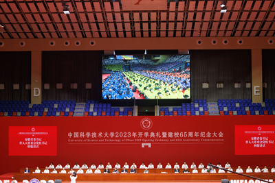 本报讯 金秋佳色,荟萃其英。9月20日,中国科学技术大学2023年开学典礼暨建校65周年纪念大会在中校区综合体育馆隆重举行。校友代表、第十一届全国政协副主席、中国科学院院士王志珍,安徽省委书记、省人大常委会党组书记韩俊,校友代表、国家最高科学技术奖获得者、中国科学院院士赵忠贤,安徽省委省政府、省有关部门领导,中国科大领导班子成员、两院院士代表、科教融合单位负责同志,以及学校各院级单位负责人出席开学典礼并在主席台就座。院系和机关有关部门负责人、2023级全体本科生、部分研究生新生及班主任参加开学典礼。校党委书记舒歌群主持开学典礼。