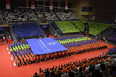 最后,全体师生起立,奏唱校歌,开学典礼在豪迈雄壮的校歌声中圆满结束。