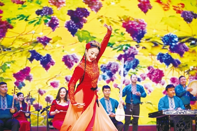 接着,新疆师范大学音乐学院的师生为观众们带来了15个来自新疆不同民族、不同风情的歌舞表演,如表现刀郎人民狩猎时的情形和凯旋时的喜悦的舞蹈《刀郎麦西来甫》;来自哈萨克族传统乐器冬不拉的器乐合奏《父亲赞》;展现帕米尔之巅翱翔的雄鹰之姿的塔吉克族舞蹈《帕米尔之情》;一曲《吐鲁番的葡萄熟了》则娓娓道来了一位维吾尔族姑娘与一位边防兵之间浪漫真挚的爱情故事……观众们在表演者的带领下,仿佛跨越了千里的时空,穿梭至美丽的新疆,聆听来自西域的风与悠长的声韵。