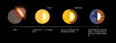 吴忠庆等人提出在基底岩浆洋演化过程中会发生水诱导的地幔反转,该反转将大量基底岩浆洋中的水运移到地球浅部,促进大陆的形成(图1)。当地幔反转耗尽基底岩浆洋后,太古宙型的大陆不再产生,太古宙末期对应着大陆形成机制的转变期,水诱导的地幔反转可以自然地解释为什么太古宙前后的大陆有完全不同的特性。类似的,水诱导地幔反转还可以解释其他多个长期困扰的现象,如:为什么几乎没有冥古宙的大陆,为什么主要在太古宙形成克拉通大陆,为什么内太阳系只有地球具有大陆等。形成基底岩浆洋和基底岩浆洋含水是水诱导地幔反转的两个前提,由于大撞击在基底岩浆洋形成中的关键角色,月球远比我们想象的重要。