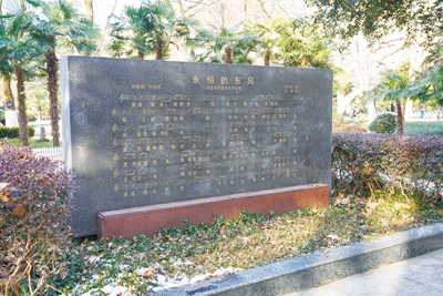 纪念碑的另一面,镌刻着由郭沫若作词、吕骥作曲的中国科大校歌《永恒的东风》。“迎接着永恒的东风,把红旗高举起来,插上科学的高峰!科学的高峰在不断创造,高峰要高到无穷,红旗要红过九重。我们是中国的好儿女,要刻苦锻炼,辛勤劳动,在党的温暖抚育、坚强领导下,为共产主义事业作先锋……”校歌不仅旋律优美,曲调高亢,更是内涵深刻。周恩来总理还曾亲自为校歌修改过两个字,将“为共产主义建设作先锋”中的“建设”改为“事业”。