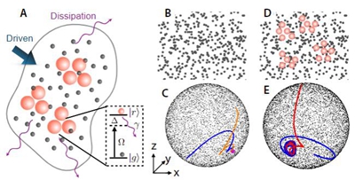 物理示意图:(A)为开放系统;(B)为遍历性相的空间均匀分布;(C)为其相空间,不同初态将弛豫到同一固定点,发生热化;(D)为弱遍历性破缺相的空间分布,空间中里德堡原子由于相互作用发生聚集;(E)为其相应的相空间,相空间中出现非稳态解(极限环),对应于长时间振荡的末态。