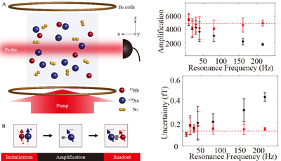 图:暗态自旋放大原理图(左);不同工作频率磁信号放大增益(右上);不同工作频率可探测的最小磁场(右下)