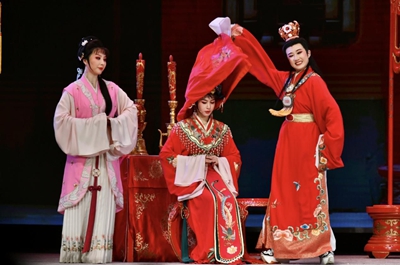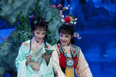 幕启,演员逐一登场,“娴静时如娇花照水,行动处比弱风拂柳”的林黛玉、“鬓发如银”慈祥宽厚的贾母、“粉面含春威不露,丹唇未启笑先闻”的王熙凤、“行为偏僻性乖张,那管世人诽谤”的贾宝玉……一个个经典的形象鲜活起来,跨越时空来到观众面前。“天上掉下个林妹妹,似一朵轻云刚出岫。”耳熟能详的经典唱段拉开了宝黛纯真爱情的序幕,让人感慨这一眼万年的美好之余,不禁为预知的结局而隐隐心痛。