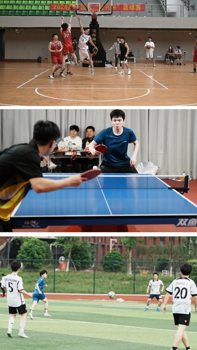 4月20日,羽毛球赛作为本届“复兴杯”揭幕赛率先开场,其设置了男子单打、女子单打及混合双打赛道,参与比赛的选手们展现出高水平的技术和卓越的团队协作能力,激烈的比赛赢得现场观众阵阵喝彩。网球与排球比赛紧随其后,在园区各运动场地有序开展,比赛氛围热烈,吸引了众多师生驻足观看。4月21日,足球、篮球和乒乓球三大项目的比赛相继展开,比赛采用小组赛和淘汰赛相结合的赛制进行,比赛选手们在激烈的对抗与博弈中全力以赴,外围传中、区域联防、反手弧球,一次次激烈的进攻与防守,展现了参赛者出色的运动能力和团队协作精神。