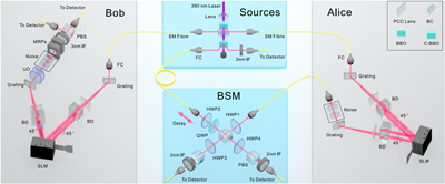研究团队首先证明了,通过对单量子系统的环境进行特定相位调制,可以完全逆转开放量子系统演化中的相位退相干,并且该方法可以被推广到任意多体系统中。然后以光子的偏振作为量子系统,光子的频率作为噪声环境进行实验。基于完全可控相位退相干量子模拟器,在环境中加载特定相位调制,从而制备出双光子偏振-频率混合纠缠初态,然后把两个光子分发给用户Alice和Bob。Alice端进行退相干演化,再与待传递的量子态做贝尔测量,接着在Bob端进行退相干演化,最终通过经典通信对得到的量子比特做相应幺正操作得到被传递的量子态,测得的保真度接近90%。由于此过程中双光子的偏振态从未违背贝尔不等式,本实验是基于隐藏量子非局域性实现了量子隐形传态。