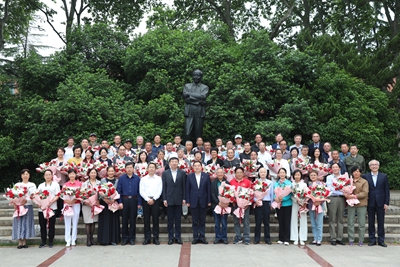 仪式在校歌《永恒的东风》旋律中落下帷幕,校领导与荣休教职工合影留念。