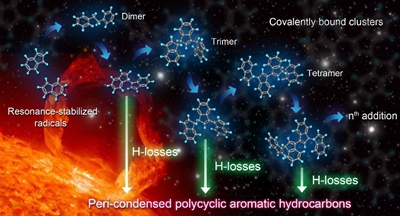 实验中观测到一系列有规律增长的共价团簇中间体。结合量化计算,发现氢原子提取和多次RSR加成推动了共价团簇的形成和快速增长。这些团簇逐步脱氢产生大尺寸的peri-condensed缩合芳烃和多环芳烃自由基,并且形成白色烟雾状的碳质颗粒。这种共价团簇逐步脱氢机制(PHLCBC)阐明了共振稳定自由基、共价团簇和peri-condensed缩合芳烃之间的重要关系,桥接了小尺寸气相自由基中间体与大尺寸纳米碳颗粒(如图所示)。该研究有望为碳质颗粒物多尺度模拟提供重要思路,并指导碳质纳米材料的合成、揭示火焰中富勒烯团簇的形成机制和新型结焦抑制剂的开发等。