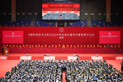本报讯 眼镜湖畔芳华初盛,也西湖边草木峥嵘。6月22日上午,中国科学技术大学2024年毕业典礼暨学位着装授予仪式在中区综合体育馆举行。校领导舒歌群、包信和、蒋一、杨金龙、傅尧、周丛照、邓建松,院士代表施蕴渝、叶向东、封东来、俞汉青,校友代表、复旦大学教授沈维孝院士,导师代表刘乃安教授,相关院系、实验室主要负责人出席仪式并在主席台就座。党委常务副书记蒋一主持仪式。
