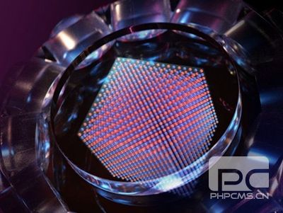 “天元”量子模拟器示意图。红色和蓝色的小球分别代表自旋相反的原子,它们在三维空间交错排列,形成了反铁磁晶体。原子被光晶格囚禁在玻璃真空腔中。制图:陈磊