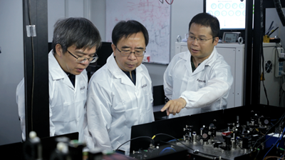 潘建伟(中)与陈宇翱(左)、姚星灿(右)在实验室讨论问题。
