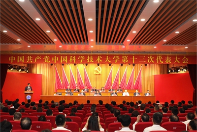 盛夏时节,万物葱茏。大礼堂雄伟庄严,会场内气氛热烈。主席台上方悬挂着“中国共产党中国科学技术大学第十三次代表大会”的会标,后幕正中是镰刀和锤头组成的中国共产党党徽,10面鲜艳的红旗分列两侧,党徽在鲜艳的红旗簇拥下熠熠生辉。