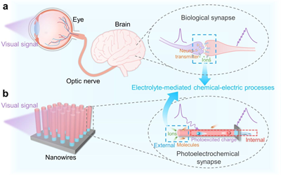 图1. 生物视觉系统(a)和光电化学神经突触器件(b)对比