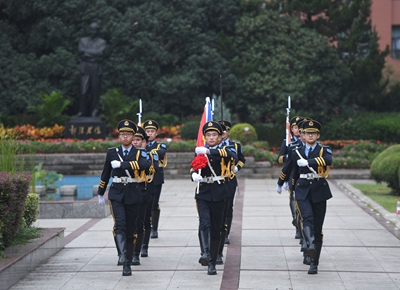 “出旗!”清晨7点整,随着一声嘹亮的口令,升旗方阵以昂首挺拔的军姿、踏着坚定的步伐、整齐划一地护卫着鲜红的国旗和蓝色的院旗、校旗迈向升旗台。“升国旗,奏唱国歌。”全体观礼师生深情注视着五星红旗冉冉升起、高高飘扬,共和国走过的75年栉风沐雨,仿佛一部波澜壮阔、气势恢宏的历史画卷映入眼帘,使命感、荣誉感与自豪感油然而生。