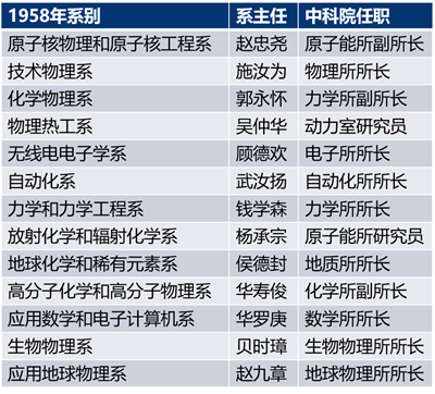 1958年6月8日,中国科大筹备委员会召开第一次会议,正式确定了校名为“中国科学技术大学”,并通过了建校方案和本年度招生简章。学校决定设置12个系,后来在赵九章的建议下,又增设了应用地球物理系。中国科大在创校初期设立了13个系41个专业,其中原子核物理和原子核工程、无线电电子学、自动化、力学和力学工程、放射化学和辐射化学、应用数学和计算技术、应用地球物理等多个系科专业,直接服务于“两弹一星”事业。