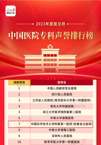 在中国医院专科声誉排名中,健康管理中心排名第7位,普外科、风湿免疫科、检验科、临床病理中心、小儿外科、耳鼻咽喉头颈外科、康复医学科、运动医学科获得全国提名。附一院是进榜和提名学科数量最多的安徽医院。