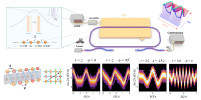 实验示意图及能带结果图。上方表示准动量空间能带测量实验示意图;插图表示模拟中链状结构的格点分布,所有的格点都被限制在一个共振峰内;下方左图表示包含长程耦合的管状结构示意图;右图表示实验测得的包含两种耦合长度的模型的能带图,其中r为两种耦合的长度比,ϕ表示光学规范势。