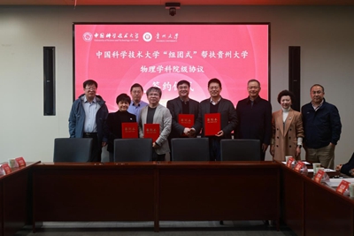 本报讯 3月19日下午,中国科大与贵州大学“组团式”帮扶物理学科院级协议签约仪式在物质科研楼C404会议室举行。中国科大党委副书记邓建松,贵州大学党委常委、副校长王锦荣出席仪式。中国科大物理学院、地球和空间科学学院,贵州大学对外合作处、物理学院、资源与环境工程学院相关负责人参加仪式。仪式由中国科大物理学院党委书记周正威主持。