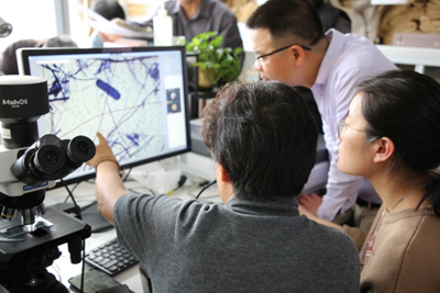 研修班学员在手工纸实验室观测自家纸样的纤维图谱