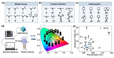 实验通过三种类型(含有甲基的、柔性链胺以及刚性胺,图a-c)的三级胺分子和萘酰亚胺进行光照实验,结果表明,光致发光量子产率和发射颜色受三级胺的取代基和分子柔韧性的显著影响;含有甲基的三级胺分子会快速呈现绿色,而不含甲基的柔性胺表现为显著的黄色(图d-e)。