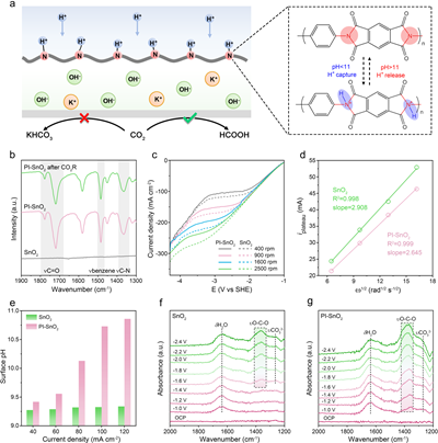 为克服酸性CO2R中的内在权衡,研究人员在SnO2纳米颗粒上修饰聚酰亚胺(PI-SnO2),这种耐酸性胺基聚合物可通过其丰富的-N-官能团捕获H⁺,从而减少电解液中自由H⁺浓度。他们通过HER极化曲线、原位拉曼及原位红外测试,如图所示,证实了聚酰亚胺在酸性CO2电解条件下能有效抑制H⁺向电极表面扩散,从而提高电极表面局域pH,促进关键中间体*OCHO的生成。在300 mA cm⁻2,PI-SnO2实现了96%的HCOOH FE,且在CO2流速为1 sccm下,PI-SnO2的SPCE高达96%,超越了此前报道的碱性、中性和酸性(高K⁺浓度)条件下的CO2电解性能。