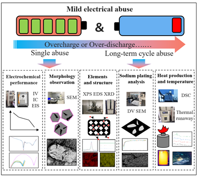 研究团队采用先进的电化学测试和材料表征技术,研究了钠离子电池在单次轻微电滥用和长期轻微电滥用循环下安全特性的降解机制和途径。如图展示了本文采用的技术路线,发现单次轻微电滥用对电池容量的影响很小,但会显著改变活性电极材料的界面阻抗和性能。过充会使固体电解质界面阻抗增大,副反应加剧,而过放则导致固体电解质界面溶解和活性物质损失。轻微过充还降低了热失控的触发温度,加速了镀钠导致的升温速率,显著增加了热失控风险。相比之下,过放电对热失控行为的影响较小,可能还会略微延迟过充诱导热失控的发生。对于遭受长期轻微电滥用的钠离子电池则会表现出显著的电化学性能退化,且导致阳极表面镀钠积累,而镀钠程度与过充电次数呈正相关。该研究不仅阐明了轻微电滥用下钠离子电池安全特性的退化机理,也为钠离子电池的优化设计和安全性评估提供了理论支持。