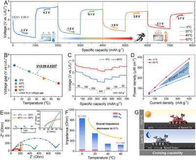 火星具有复杂的自然环境,包括含有多种气体的火星大气以及剧烈的温度波动。锂-火星气体电池因可直接利用火星大气释放电能,被视为未来火星基地的供能技术。然而,电池在宽温域下的反应路径复杂、界面易失效等问题制约其应用。本研究揭示了温度通过调控“两电子-四电子反应路径竞争”和“固态产物生长模式”主导电池性能,且低温下容量衰减的关键因素来源于过量无定形碳导致的界面钝化。