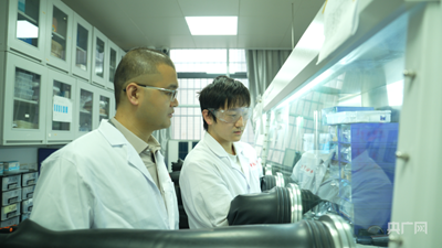 徐集贤(左)与团队成员在实验室进行电池模组研发调整
