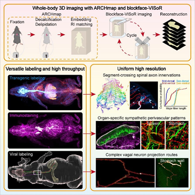 毕国强教授、刘北明教授联合合肥综合性国家科学中心人工智能研究院和中国科学院深圳先进技术研究院团队,突破性研发出全球最快的小动物全身亚细胞分辨率三维成像技术,首次实现小鼠全身神经网络精细三维图谱高清绘制。相关成果于北京时间7月10日发表于国际学术期刊《细胞》(Cell),为解析周围神经调控网络及疾病机理研究提供了全新工具。